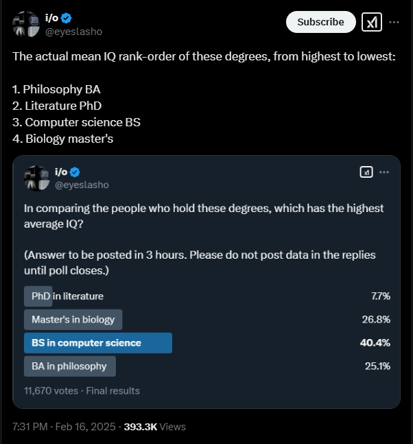 philosophy obviously requires the most critical thinking. and before we go any further, that’s what we’re talking about when we talk about “intelligence” and “IQ”; we’re, in practical terms, referencing the ability to critically think through various degrees of abstractions. so, when we think about the process of thinking, it’s like, ok, well, that’s what philosophy is. Philosophy is the art of asking questions. this requires the skillset of both wordcel, used to describe ideas, and shape-rotation, used to rotate abstractions.